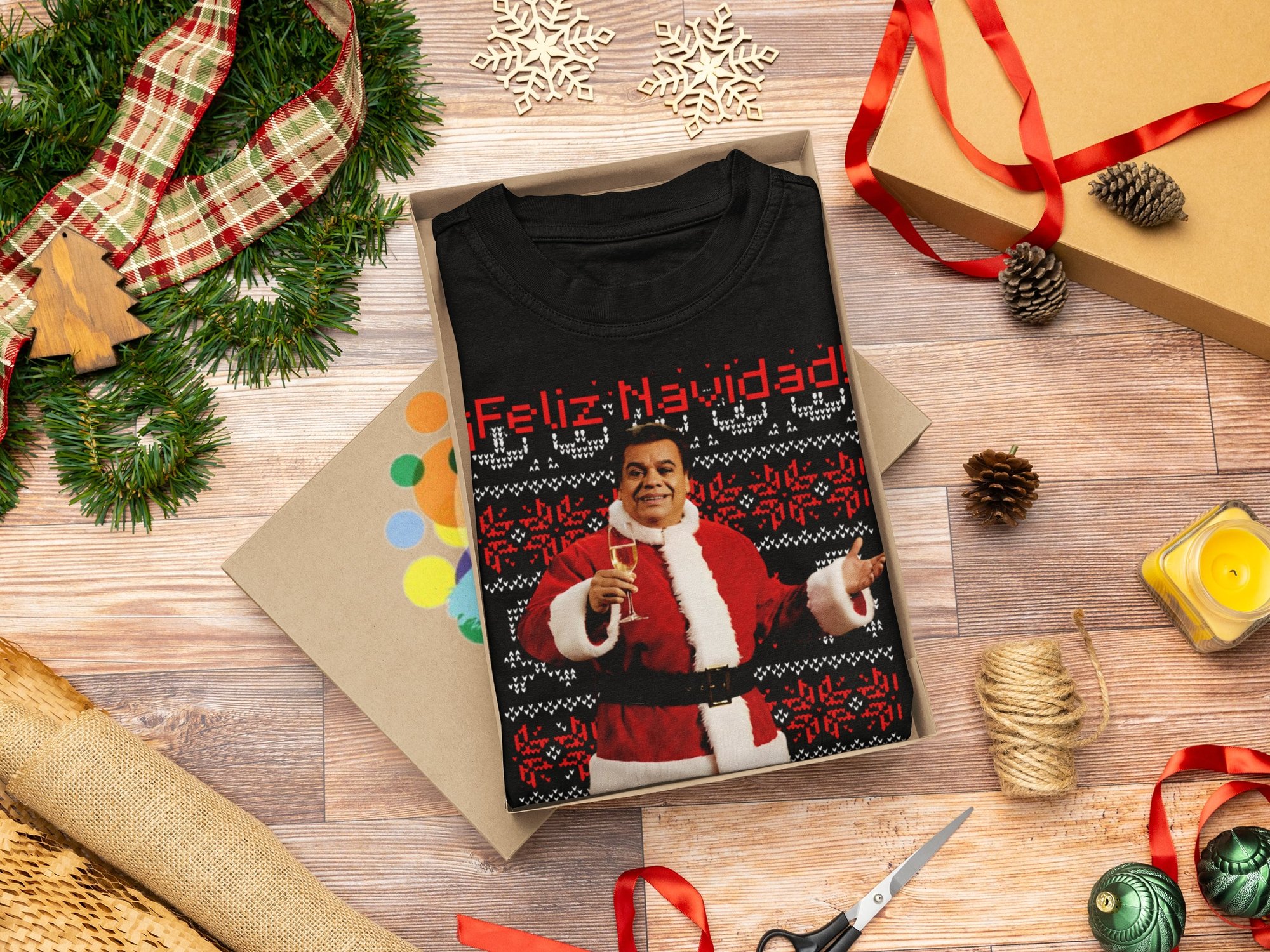 -The "Abrazame Que El Tiempo Pasa" Christmas t-shirt features a Feliz Navidad design. 🎅
