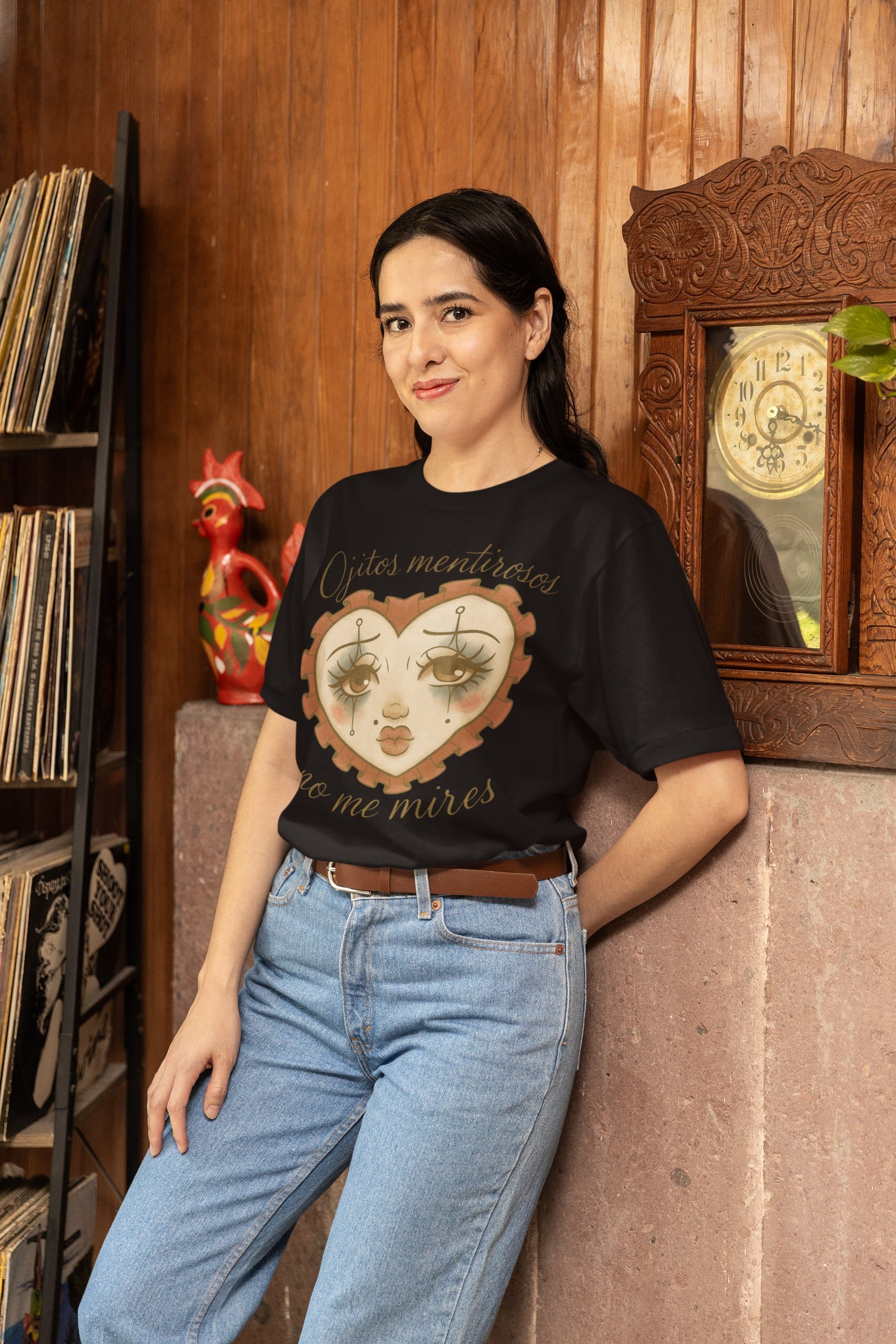 La frase "Ojitos mentirosos no me mires" se arquea elegantemente alrededor del gráfico, dándole a la camiseta un aire poético y misterioso.