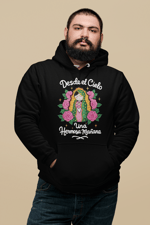 This hoodie features a full-color design of the Cartoon Virgen De Guadalupe. It is a black hooded sweatshirt, perfect for those who appreciate artistic and spiritual imagery. The hoodie combines comfort with a meaningful message.