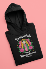 The design includes a full-color illustration of the Cartoon Virgen De Guadalupe. It captures the essence of "Desde el Cielo Hermosa Mañana." The black hoodie provides a sleek and versatile look. Ideal for casual wear or as a statement piece.