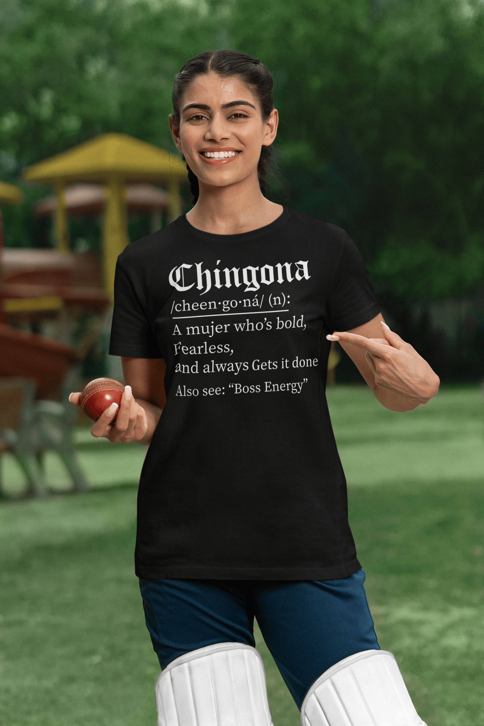 Front print: The word "Cabrona" with its phonetic pronunciation and empowering definition.