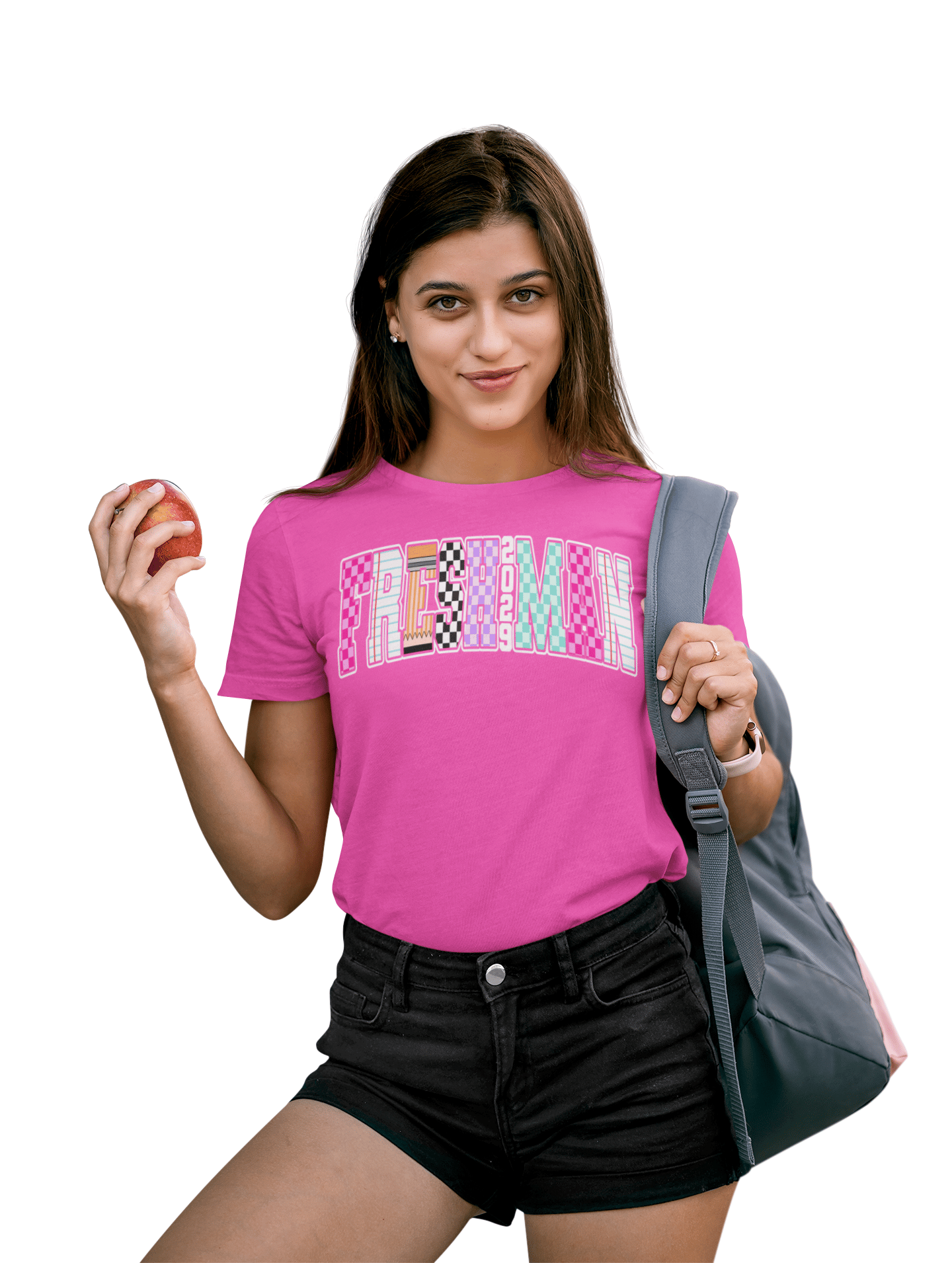 Stylish Design: This trendy graphic tee features a vibrant "FRESHMAN" print, showcasing a playful mix of patterns and colors to capture the excitement of starting your academic journey.