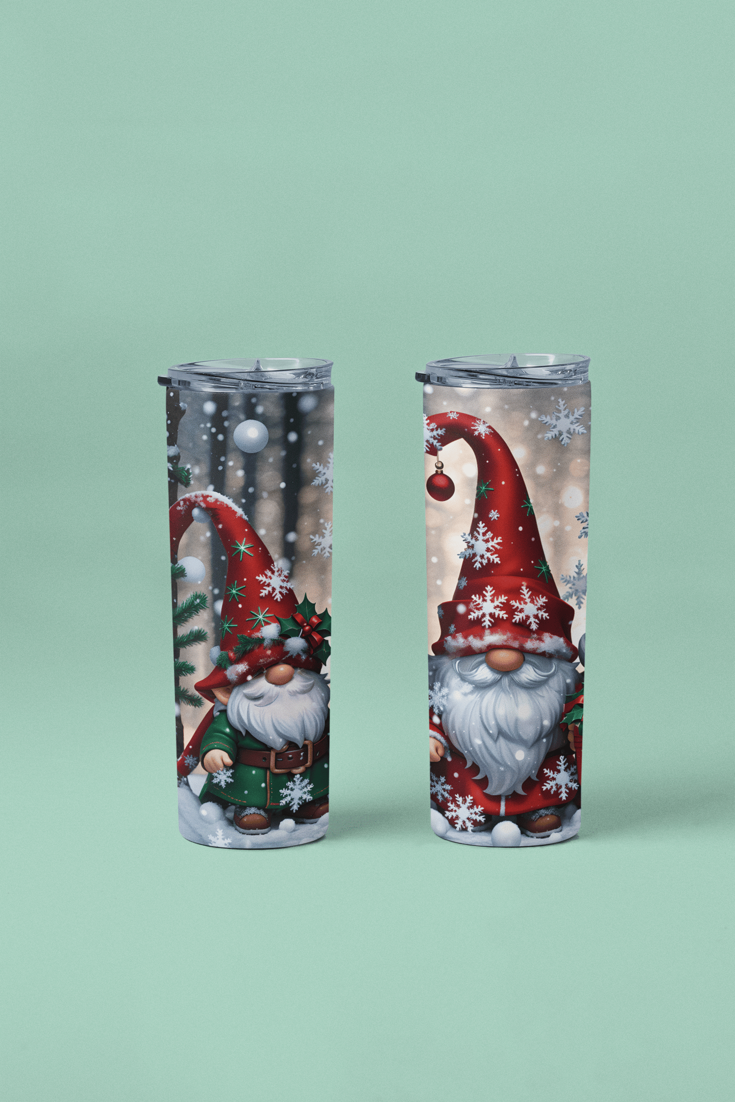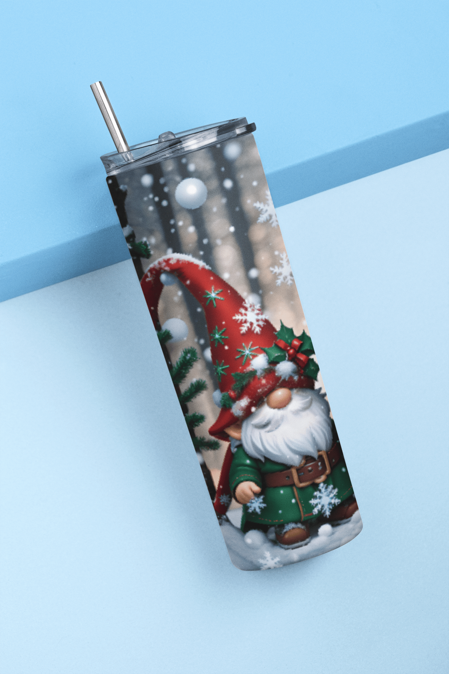 This 20oz tumbler features a charming Gnome Christmas design, adorned with snowflakes and gnome artwork. Perfect for holiday cheer! The festive design adds a touch of joy to your drinks.