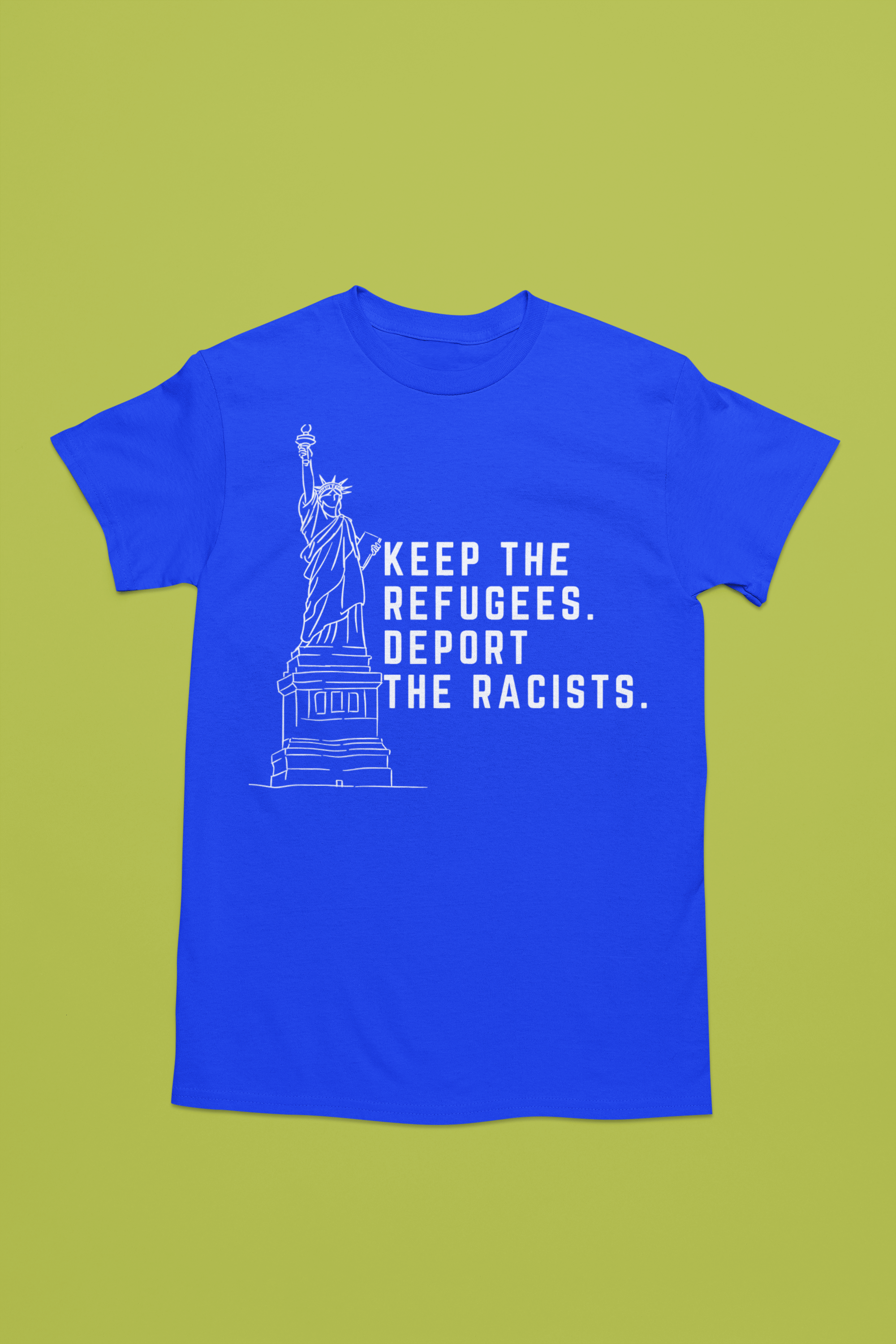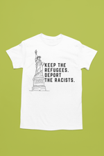 -This unisex shirt supports the message "Keep The Refugees Deport the Racist." It's a clear political statement piece for anyone who aligns with this cause. The shirt is black with the message printed in white.