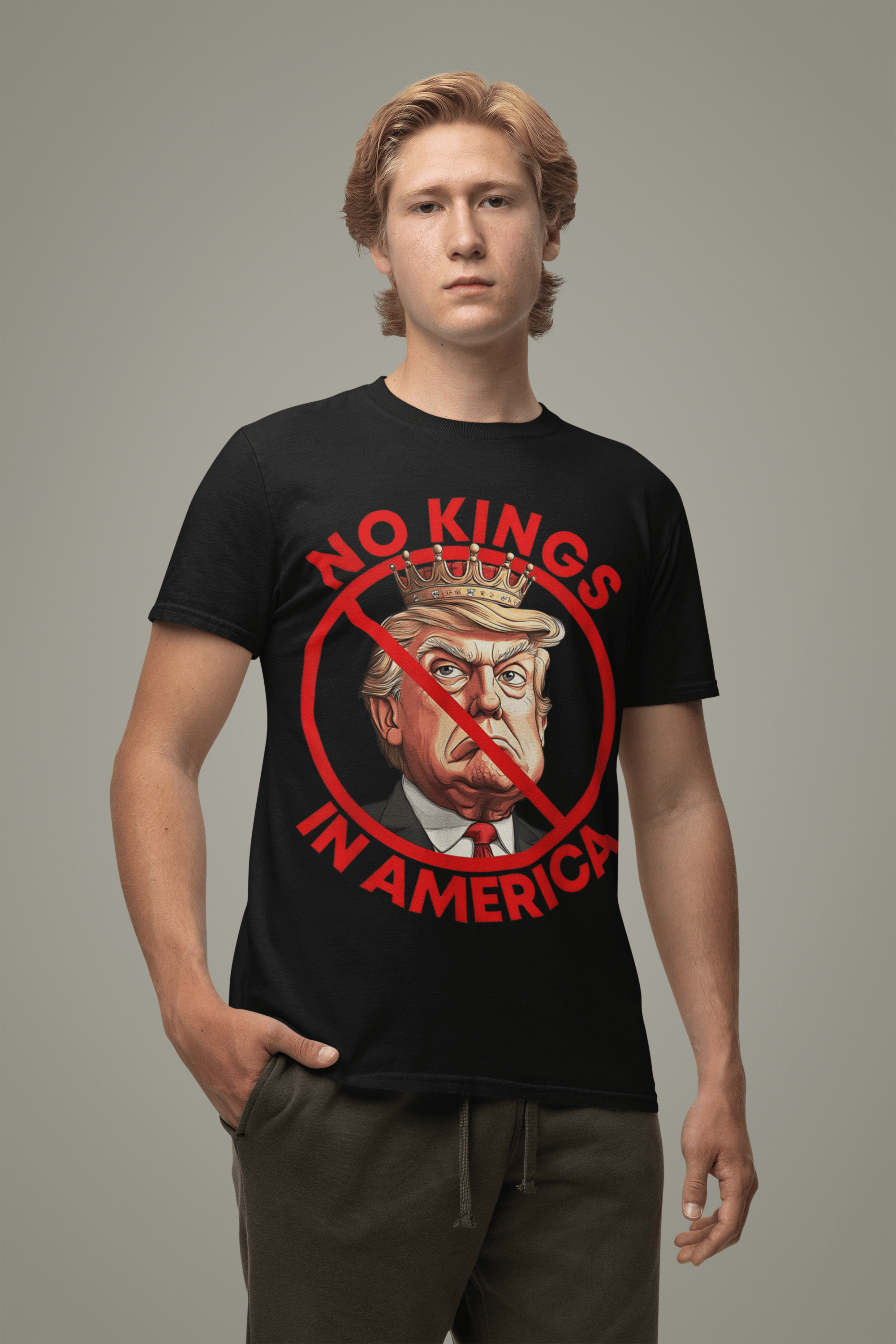 -Bold Front Graphic: “NO KINGS IN AMERICA” in striking red, surrounding a stylized crowned figure crossed out by a prohibition circle.