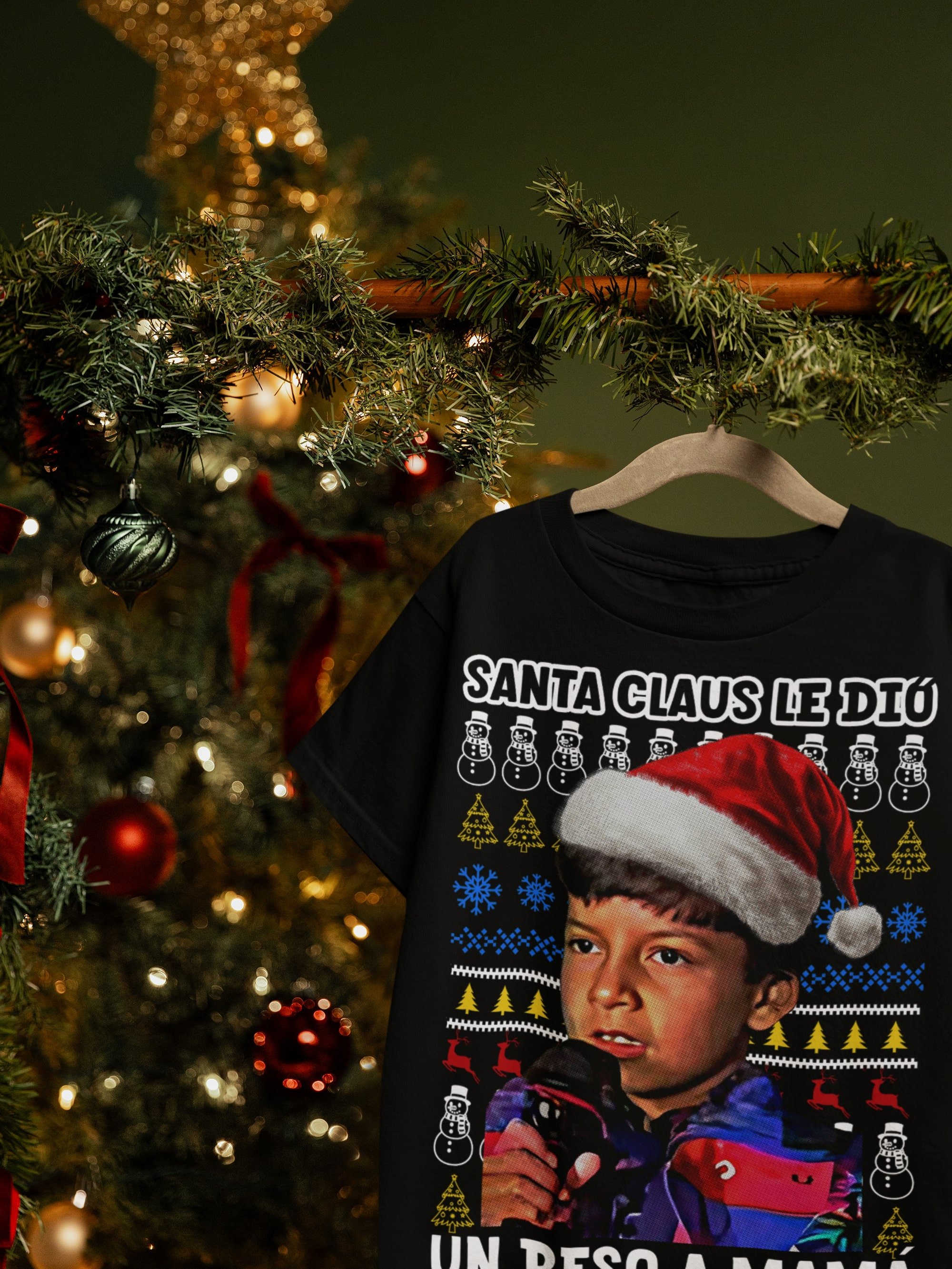 -The t-shirt showcases a Santa Claus character. It also includes the text "Le Dio Un Beso a Mama."