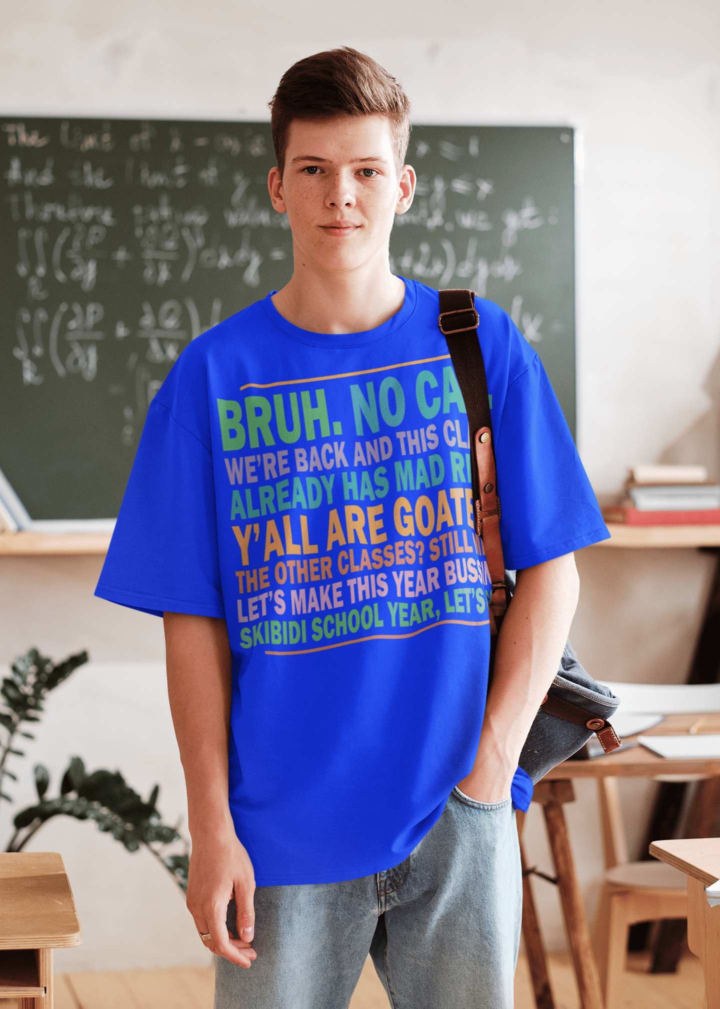 Bold Design: Features a vibrant graphic that reads, “BRUH. NO CAP. WE’RE BACK AND THIS CLASS ALREADY HAS MAD RIZZ. Y’ALL ARE GOATED. THE OTHER CLASSES? STILL MID. LET’S MAKE THIS YEAR BUSSIN'. SKIBIDI SCHOOL YEAR, LET'S GO!” This eye-catching text reflects the excitement and energy of a new school year.