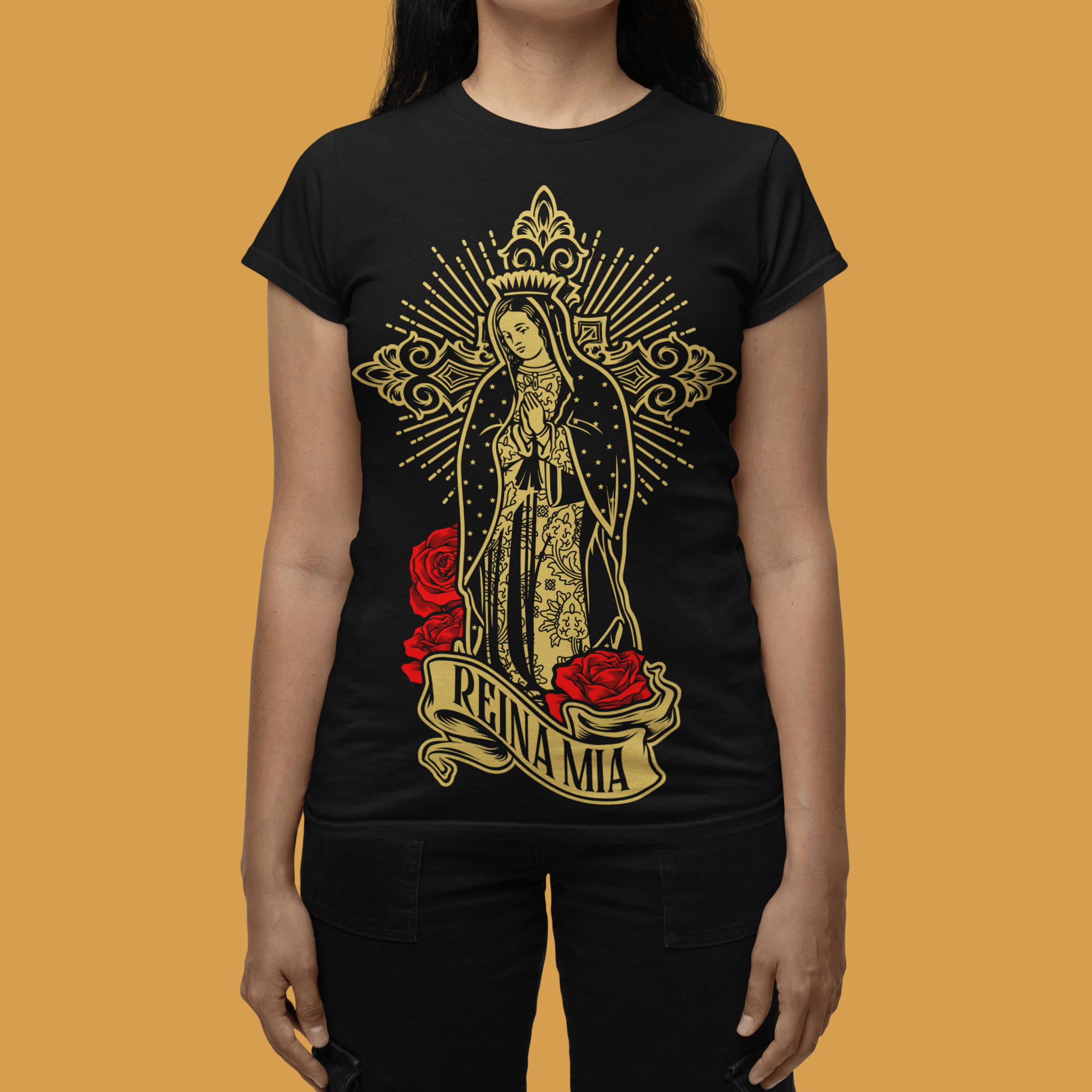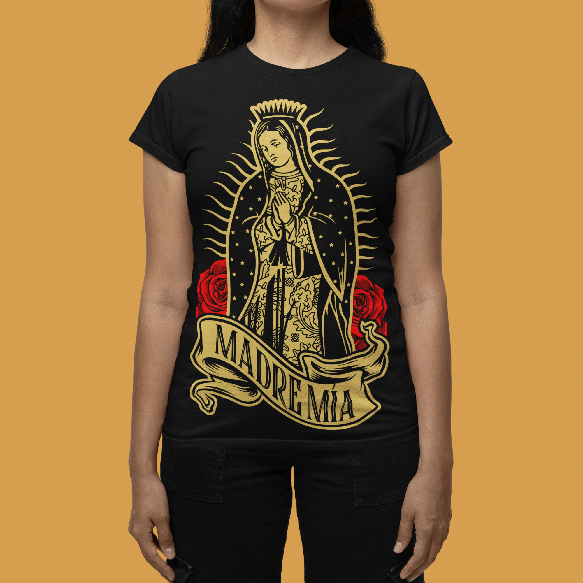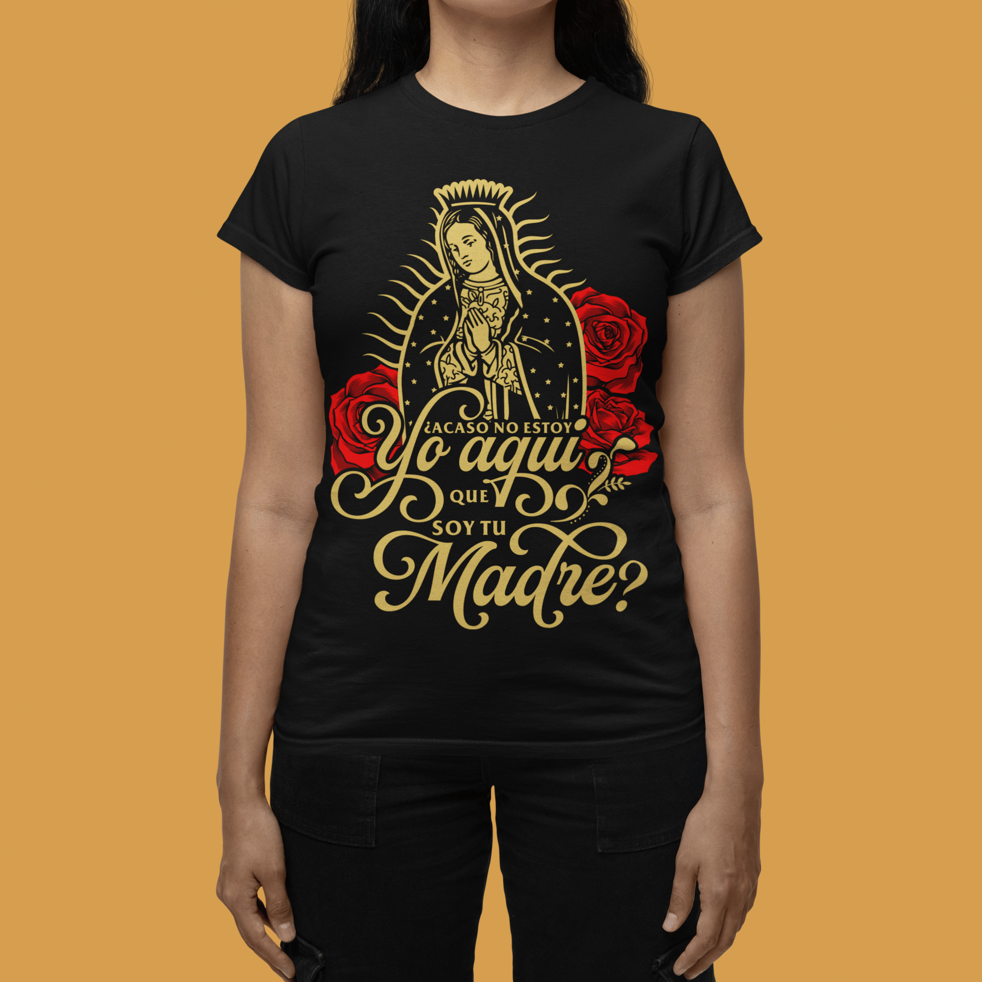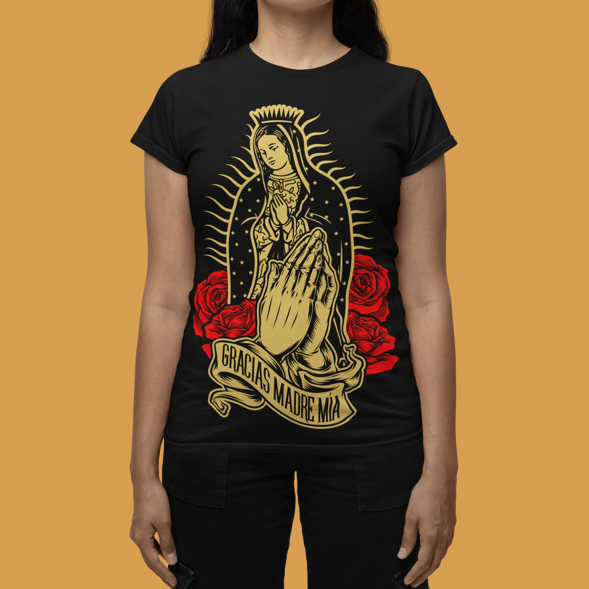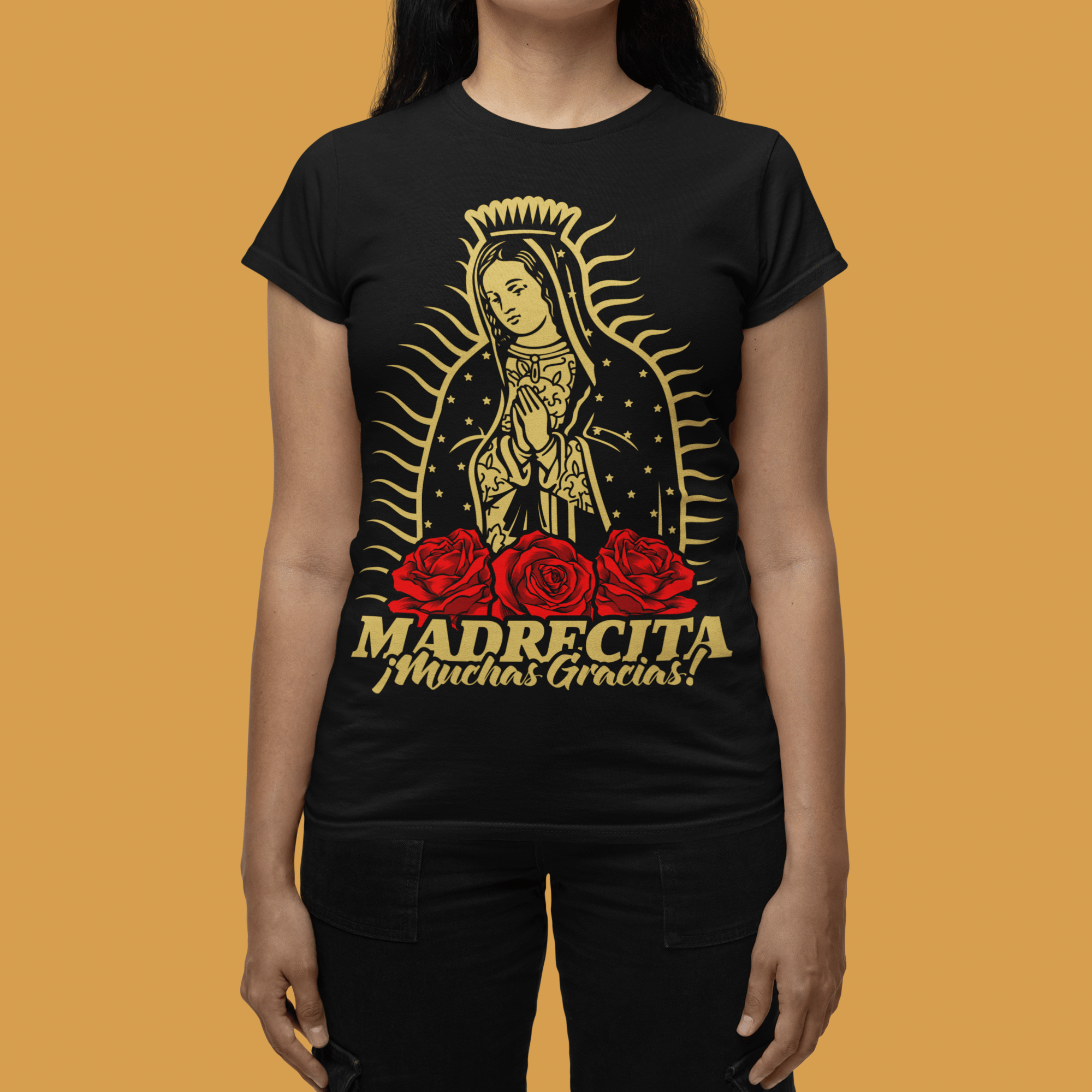 -Four unique graphic variations present heartfelt Spanish phrases such as "Gracias Madre Mía," "Madrecita ¡Muchas Gracias!," "Reina Mía," and "¿Acaso no estoy yo aquí que soy tu madre?" making this tee a powerful statement of faith and appreciation.